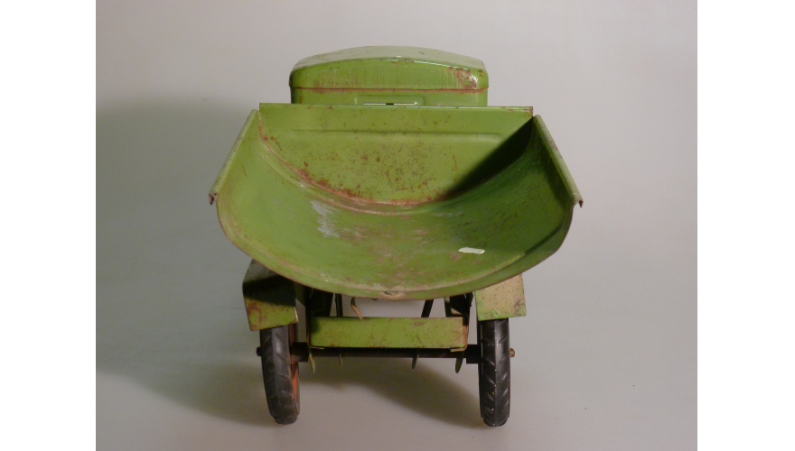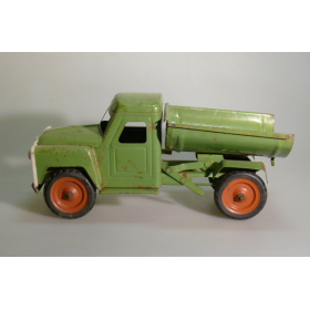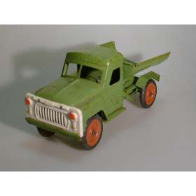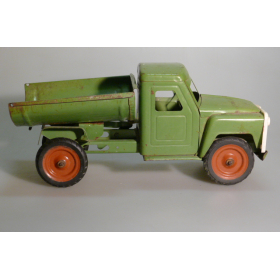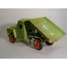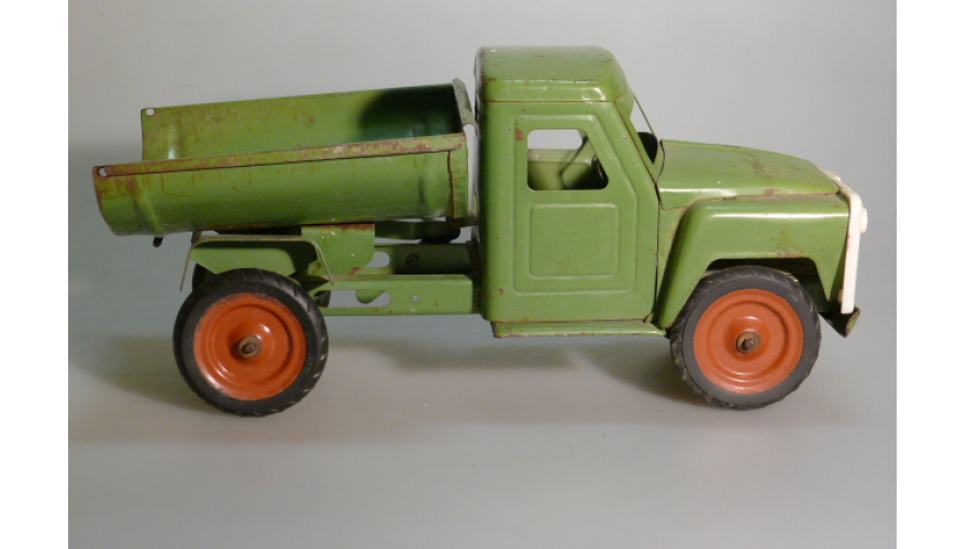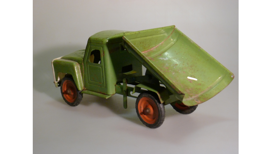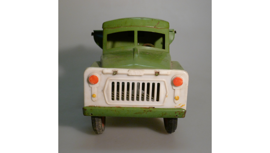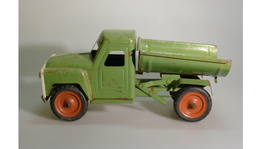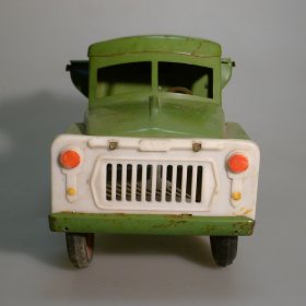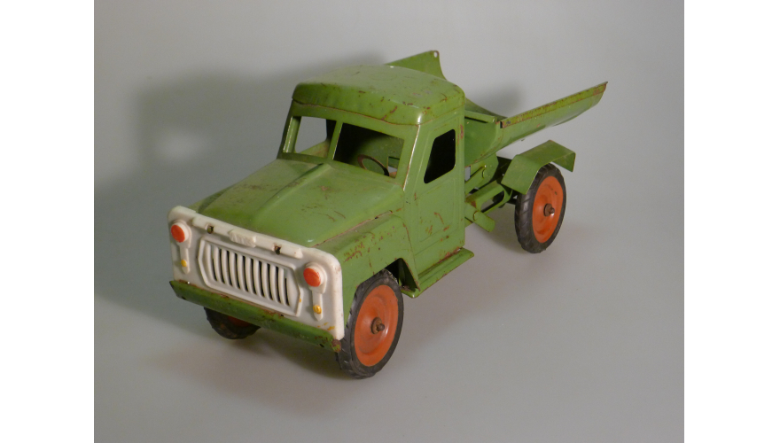 Игрушка производства СССР 70-80 годы. Большой жестяной грузовой автомобиль Газ самосвал, зеленого цвета. Длина 43 см., высота 20 см., ширина 20 см. Игрушка не продается, коллекция музея «ХОББИПЛЮС».