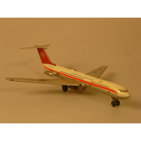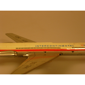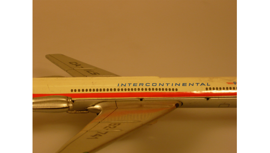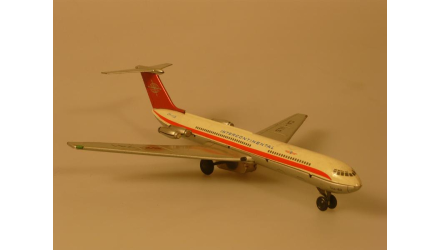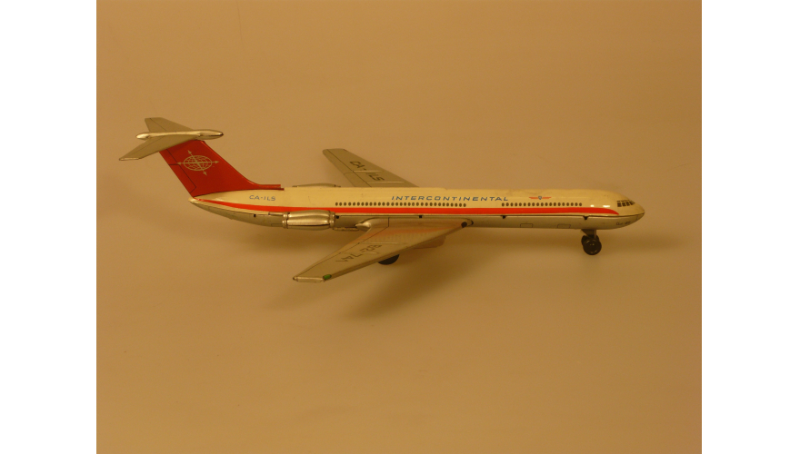 Игрушка жестяная самолета Ил-62, ГДР, в 70-80. Длина 18 см., высота 7 см., ширина 8 см. Самолет Ил-62 компании «INTERCONTINENTAL».